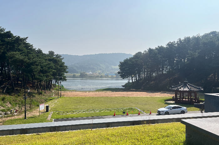 유교문화진흥원 뒤로 병사저수지가 보이고, 오른쪽 정자는 鉉率亭